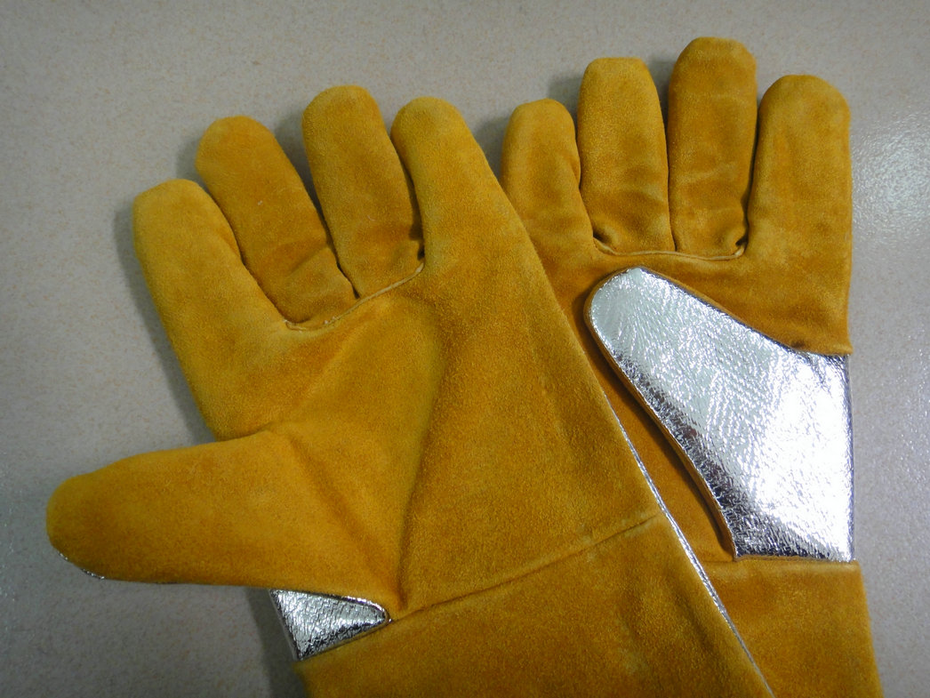 產(chǎn)品描述:14"yellow cowhide split leather welding glove,silver high temperature resistance material on back and thumb,wing thumb,with full-sock jersey lining,welted seam,self leather binding,KEVLAR thread stitching. Quality standard available:A grade,A/B grade
