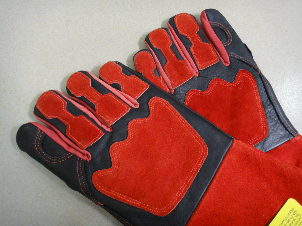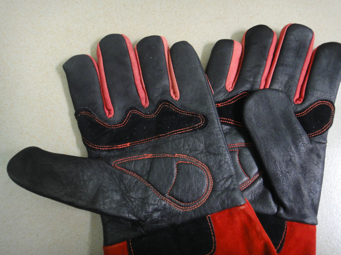14" red cowhide split leather quakeproof welding glove,red split leather cuff,full lining,self leather binding.
