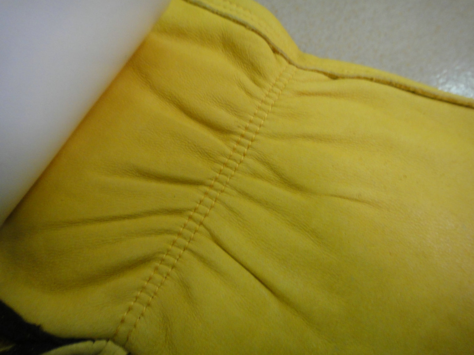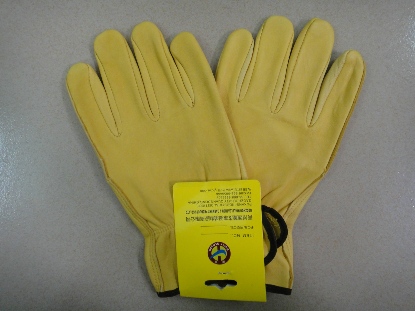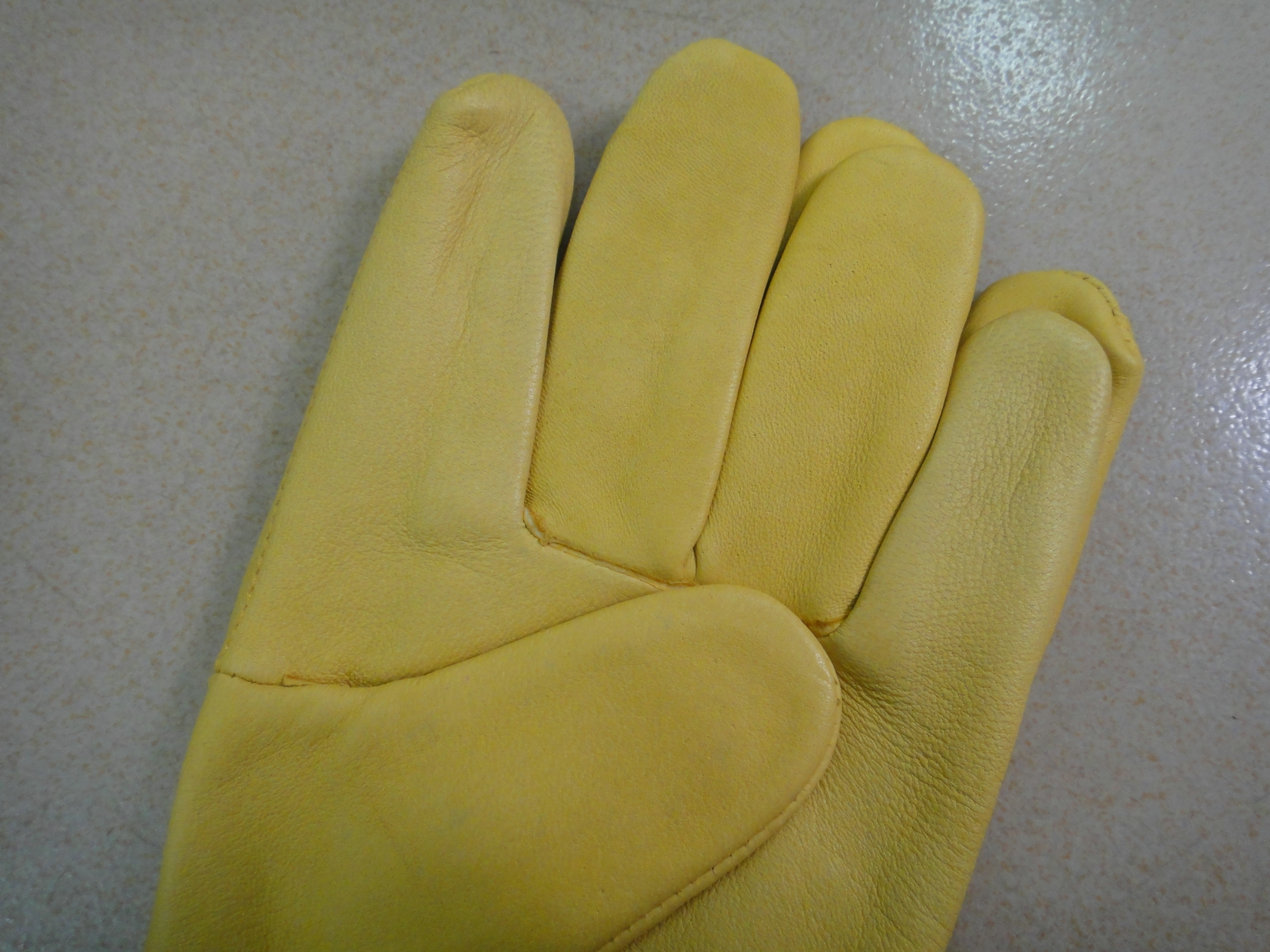 黃色牛頭層皮司機手套,橫指款,車人字形橡筋,無里,拉棕色邊。