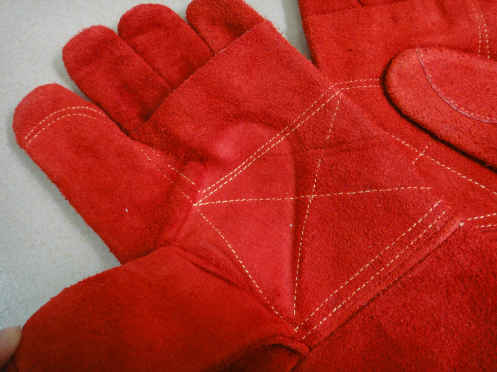 16"紅色加大托電焊,兩片皮背,托為大托(群托并且有弧度,不是直角),連大拇指,加強(qiáng)拇指部位,包半食指(圓形),不要傍冠,無任何夾眉,皮回邊,什絨里+白斜袖,托車雙線。