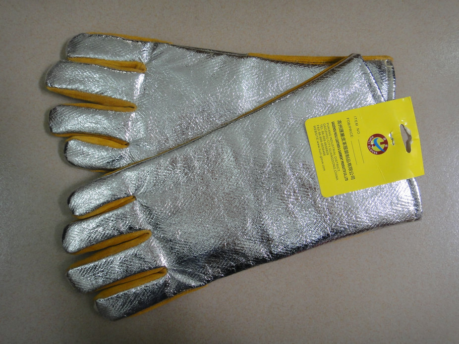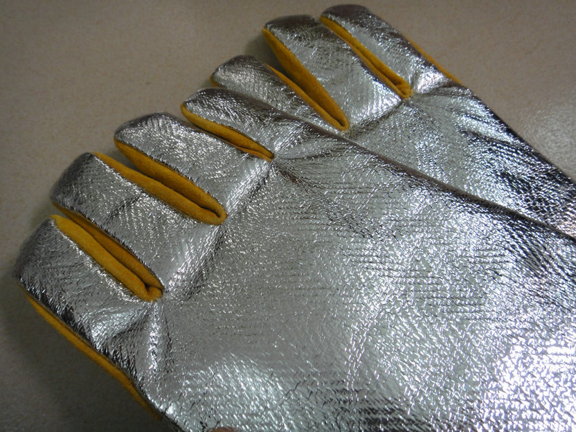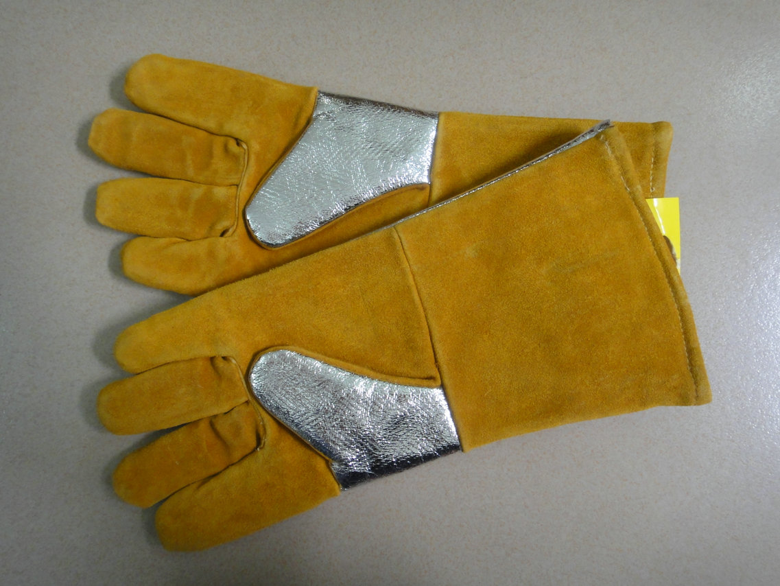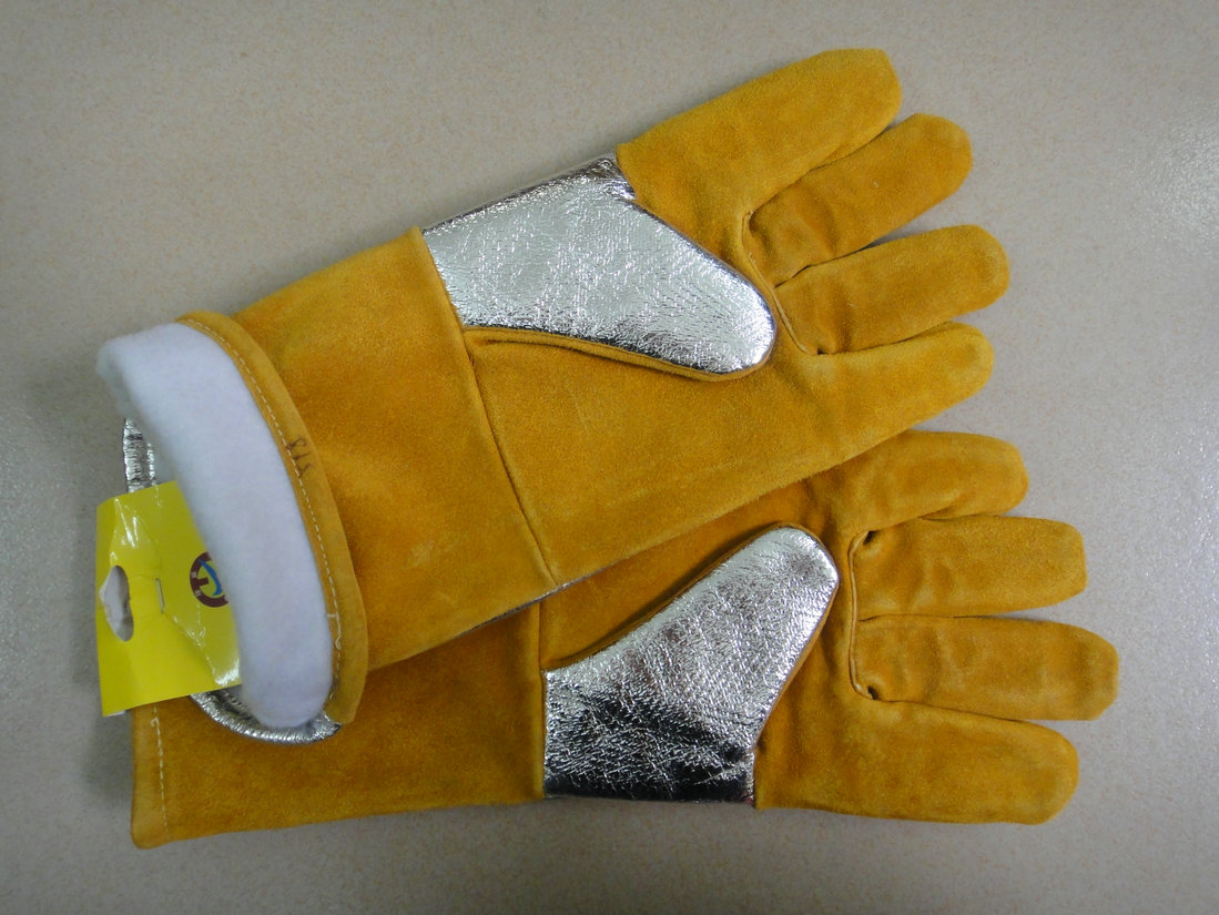 14寸金黃色牛二層皮電焊手套,背面加銀色耐高溫材料,白色絨全封里,車防火線,皮回邊。