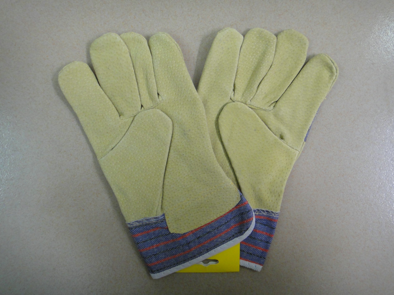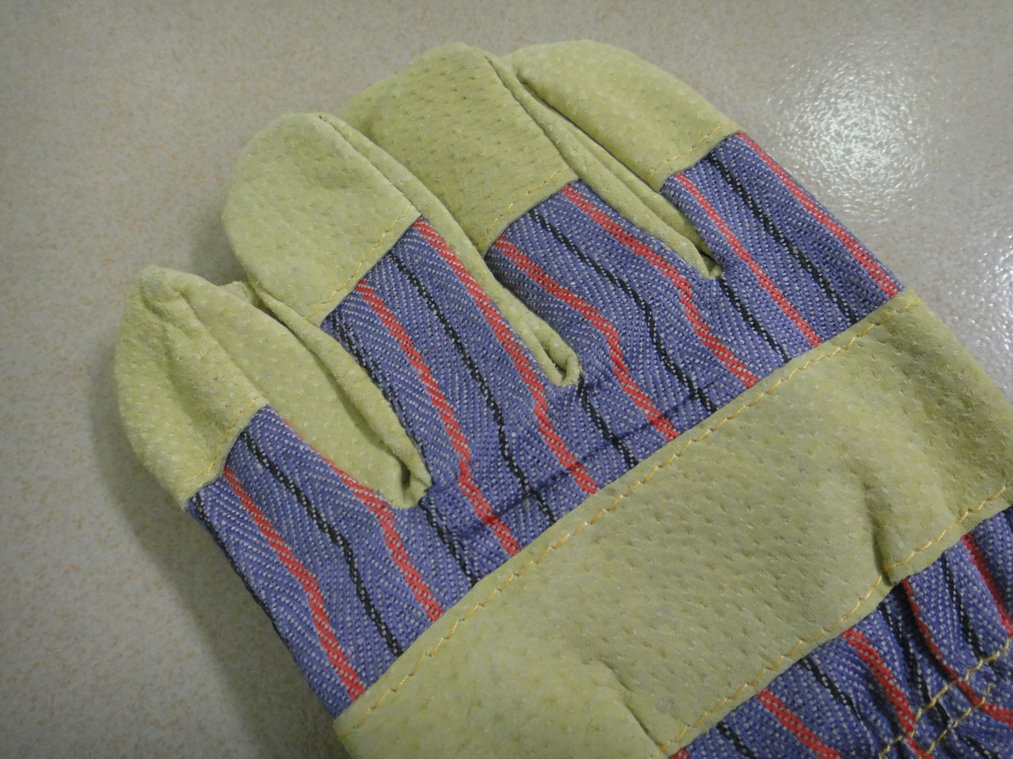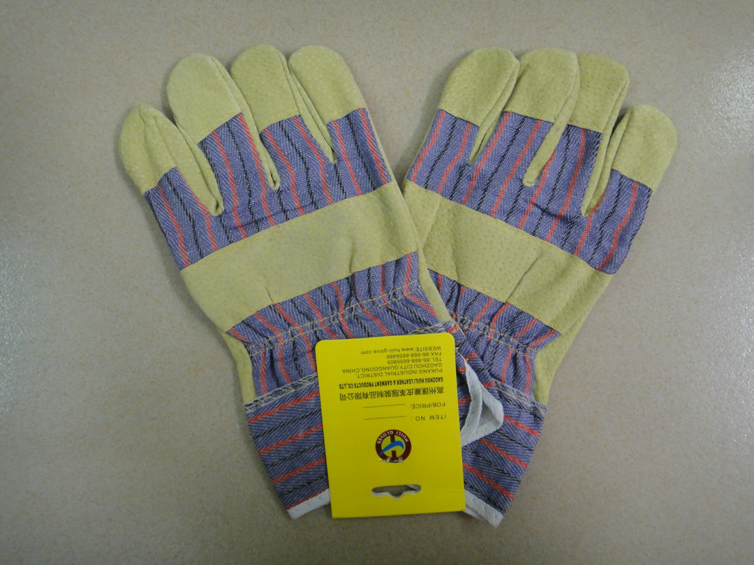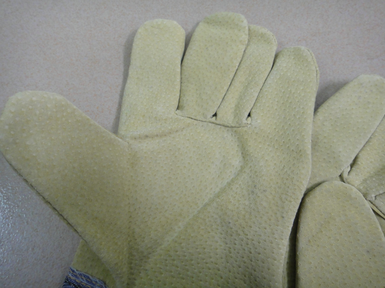 10.5寸淡黃色豬二層皮工作手套,88款,藍(lán)黑紅背布和漿袖,雜布半里,拉白邊。