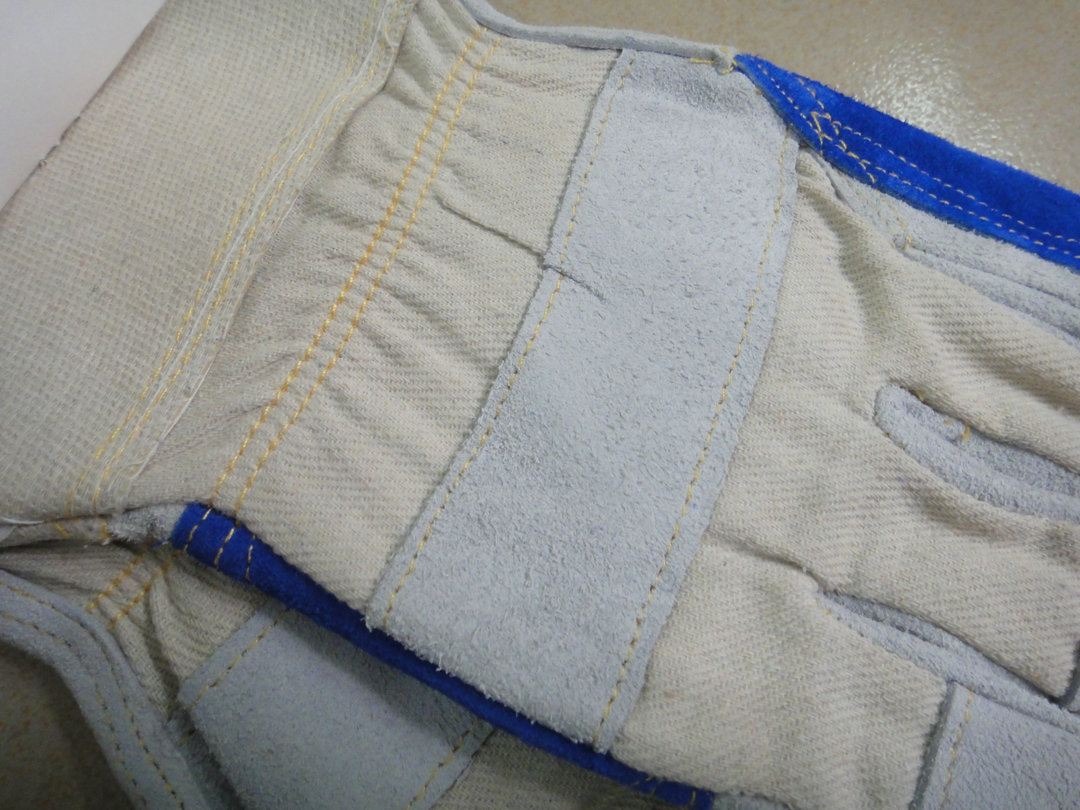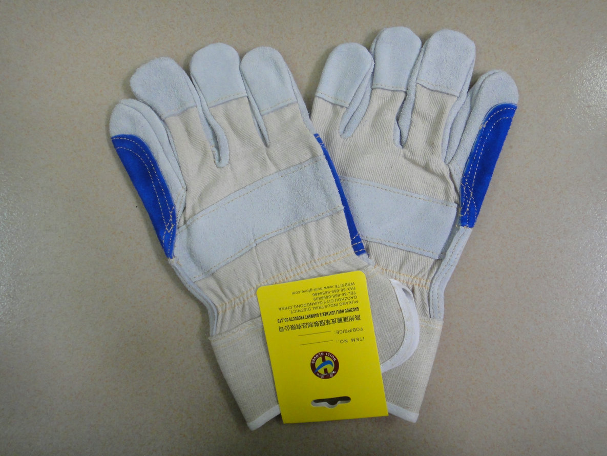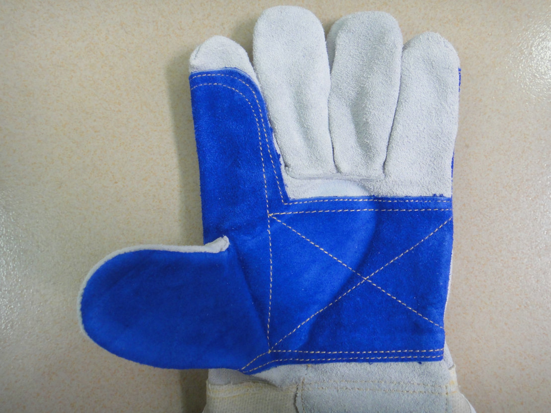 10.5寸本色牛二層皮工作手套,手掌加藍(lán)色牛二層托連拇指,食指。白斜背布和膠袖,雜絨半里,拉白邊。