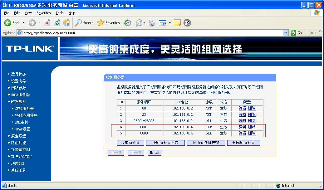 在TP-Link 的“轉(zhuǎn)發(fā)規(guī)則”/“虛擬服務(wù)器”的配置界面上,如圖2所示配置“虛擬服務(wù)器”。