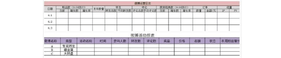 微博營銷是一個實(shí)時(shí)的動態(tài)營銷方式,它本身包含很多數(shù)據(jù)指標(biāo),如粉絲數(shù)、微博數(shù)、評論轉(zhuǎn)發(fā)數(shù)、訂單銷售、流量等。包括分析行業(yè)其他微博的運(yùn)營情況,也需要跟蹤觀察,做好一些記錄。根據(jù)筆者運(yùn)營的經(jīng)驗(yàn)來看,一般包括微博日志、活動報(bào)表,微博日志是最重要的,應(yīng)該保持每天更新記錄,活動報(bào)表可以周為單位做匯報(bào)。