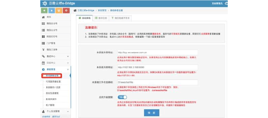 使用更多的微信及釘釘開(kāi)放的接口,外網(wǎng)地址建議使用經(jīng)過(guò)ICP 備案的域名來(lái)訪問(wèn),比如泛微公司的地址:http://wx.weaver.com.cn或者h(yuǎn)ttp://wx.weaver.com.cn:8088)