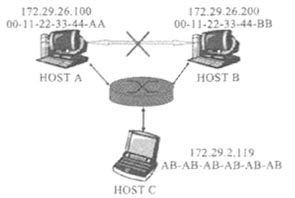 后將信息發(fā)送給主機B時是按攻擊者主機C的MAC地址尋
