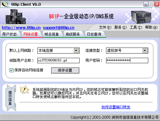 基于動(dòng)態(tài)IP/DNS技術(shù)的《88IP 》系統(tǒng)通過運(yùn)行一個(gè)客戶端軟件,可使ISDN 、ADSL 、Cable Modem、 小區(qū)寬頻網(wǎng)絡(luò)等各種分配公網(wǎng)IP 的internet 接入線路全面升級,使其擁有和專線相媲美的功能。
