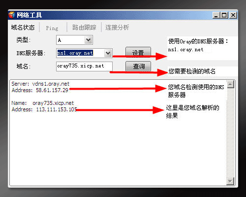 操作完成后,您的花生殼已經(jīng)登錄在線(xiàn)了,所申請(qǐng)的免費(fèi)域名oray735.xicp.net 已經(jīng)綁定到當(dāng)前的公網(wǎng)IP 地址了。