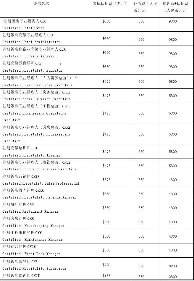 (2)總監(jiān)資格認(rèn)證培訓(xùn):CRDE 注冊飯店房務(wù)總監(jiān)、CFBE 注冊飯店餐飲總監(jiān)、CHRE 注冊飯店人力資源總監(jiān)、CHT 注冊高級培訓(xùn)師、CEOE 注冊飯店高級工程總監(jiān)、CHHE 注冊飯店客房總監(jiān)、CHSP 注冊飯店高級營銷師。
