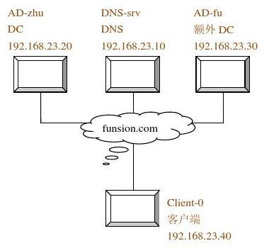 這里我們設計的環(huán)境是一臺DNS 服務器(DNS-srv ) 主域控制器(AD-zhu ) 額外域控制器(AD-fu 點擊查看額外控制器的作用),另外為了檢驗控制器安裝成功與否,是否以擔負其作用,我們再安排一臺客戶端(client-0)用來檢測。(其中由于服務器特性需要指定AD-zhu 、AD-fu 、DNS-srv 為靜態(tài)地址)