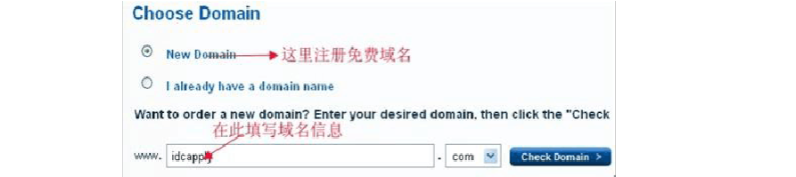 2、 選擇上圖中的Buy Now 按鈕后進(jìn)入主機(jī)購買頁面,首先需要填寫域名相關(guān)信息,大家如果自己已經(jīng)有域名,那么這里可以填寫自己已有域名,當(dāng)然也可以注冊LunarPages 提供的免費(fèi)域名,具體如下圖: