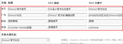 這里包括了站點(diǎn)首頁(yè)、廣場(chǎng)、群組、以及家園各頻道的標(biāo)題、SEO 描述以及SEO 關(guān)鍵字。