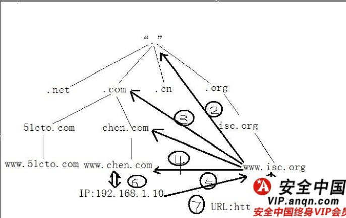 如果在chen.com 域中直接查詢www.chen.com ,查詢結(jié)果將直接輸出。如果在www.isc.org 服務(wù)器查找www.chen.com ,對于一個(gè)毫不相關(guān)的www.chen.com DNS服務(wù)名稱,首先將客服端請求發(fā)送到根域,再查到二級域.com, 最后查詢到管www.chen.com 的域名chen.com. ,在由chen.com 查找是否有注冊的www.chen.com ,最后將結(jié)果返回到www.isc.org 服務(wù)器再輸出客戶端。