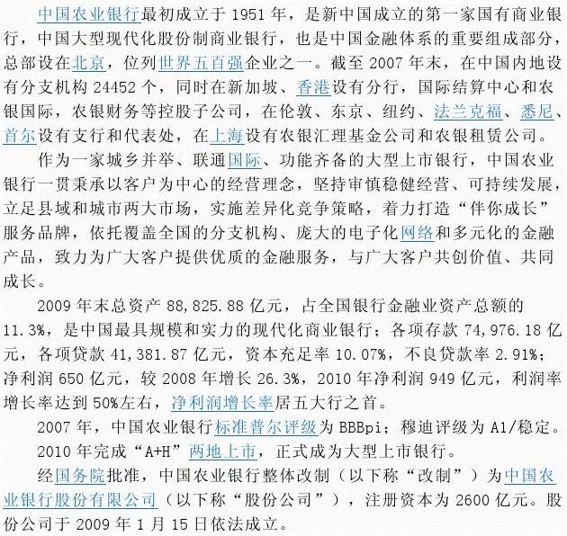 農業(yè)銀行股份有限公司注冊地址:北京市東城區(qū)建國門內大街69號 2010年7月15日,農行公司網(wǎng)上發(fā)行的103.10億股在上交所掛牌交易;H 股交易時間在7月16日在香港成功上市,至此四家國有大行全部完成“A H”兩地上市。農行A H股IPO 在全球募集221億美元,成為歷史上全球資本市場最大IPO 。