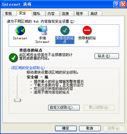 在“Internet 選項(xiàng)”彈出窗口中,選擇“安全”頁,單擊選中“受信任的站點(diǎn)”,然后點(diǎn)擊右下“默認(rèn)級別(D)”按鈕,設(shè)置受信任站點(diǎn)的安全級別為“低”, 如圖5所示。