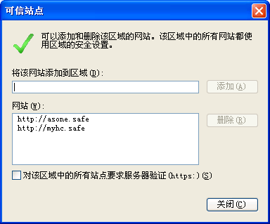點(diǎn)擊“站點(diǎn)(S)…”按鈕,在可信站點(diǎn)維護(hù)窗口中分別添加應(yīng)用服務(wù)平臺域名http://asone.safe和核查系統(tǒng)(銀行版)域名http://myhc.safe。如圖6、圖7和圖8所示。點(diǎn)擊確定保存設(shè)置并返回“Internet 選項(xiàng)”窗口。