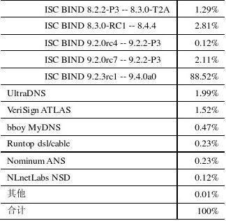 對(duì)國(guó)內(nèi)各級(jí)域名服務(wù)系統(tǒng)中的所有權(quán)威域名服務(wù)器進(jìn)行探測(cè),其中95以上的域名服務(wù)器使用開(kāi)源的ISC BIND軟件,國(guó)外權(quán)威域名服務(wù)系統(tǒng)中ISC BIND使用率約為93。