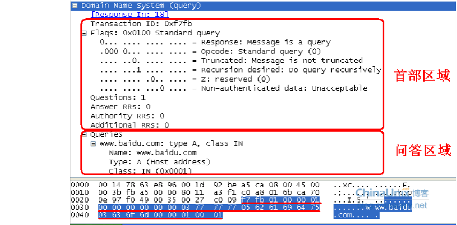 以www.baidu.com 為例,用Wireshark 俘獲分組,結(jié)合2.1的理論內(nèi)容,很容易看明白的,DNS 請(qǐng)求報(bào)文如下: