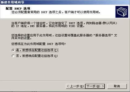 ⑺單擊“下一步”按鈕,打開(kāi)如圖8所示的“配置DHCP 選項(xiàng)”對(duì)話框,選擇“是,我想現(xiàn)在配置這些選項(xiàng)”單選按鈕。