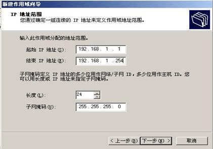 ⑷單擊“下一步”按鈕,打開(kāi)“IP地址范圍”對(duì)話框,分別在“起始IP 地址”和“結(jié)束IP 地址”文本框中鍵入實(shí)驗(yàn)要求的IP 地址范圍。如圖5。