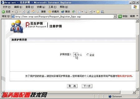 第4步,系統(tǒng)對填寫的答案格式確認(rèn)無誤后打開注冊成功頁面。為了能在網(wǎng)域科技享受全面的服務(wù),建議在成功注冊花生護(hù)照后在成功提示頁中單擊“完整資料”按鈕去填寫個(gè)人資料。在選擇“護(hù)照類型”頁面中選取“個(gè)人”單選框,并單擊“下一步”按鈕,如圖2008121821所示。