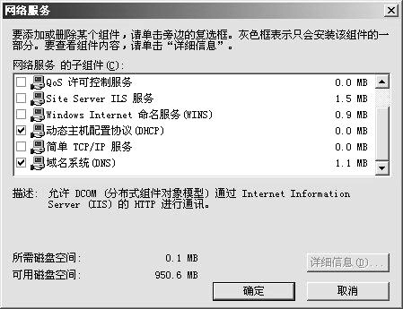 打開“控制面板”雙擊“添加/刪除程序”,在對話框中單擊“添加/刪除Windows 組件”圖標(biāo)。 看到了 Windows 組件的詳細(xì)資料后,選擇“網(wǎng)絡(luò)服務(wù)”,單擊“詳細(xì)信息”,鉤選中“域名服務(wù)系統(tǒng) (DNS)”,單擊“確定”(如圖1) 。