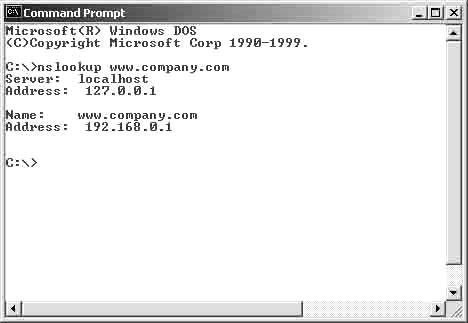 最后我們要對剛剛配制好的 DNS 服務(wù)進(jìn)行測試,具體方法是:首先在服務(wù)器上點擊“開始”菜單,單擊“運行”,在對話框中輸入command(或cmd) ,進(jìn)入MS_DOS方式下,然后在命令提示符下鍵入 nslookup www.company.com 即可看到 DNS 服務(wù)器把域名正確解析成 IP 地址 192.168.0.1 的結(jié)果(如圖7) 。