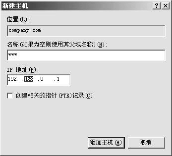 步驟 4. 展開剛剛建好的“正向搜索區(qū)域”company.com ,單擊鼠標(biāo)右鍵,選擇“新建主機(jī)”,在隨后彈出的“新建主機(jī)”對話框中,鍵入主機(jī)名稱 www ,同時指定www.company.com 對應(yīng)的 IP 地址:192.168.0.1(如圖6) 。