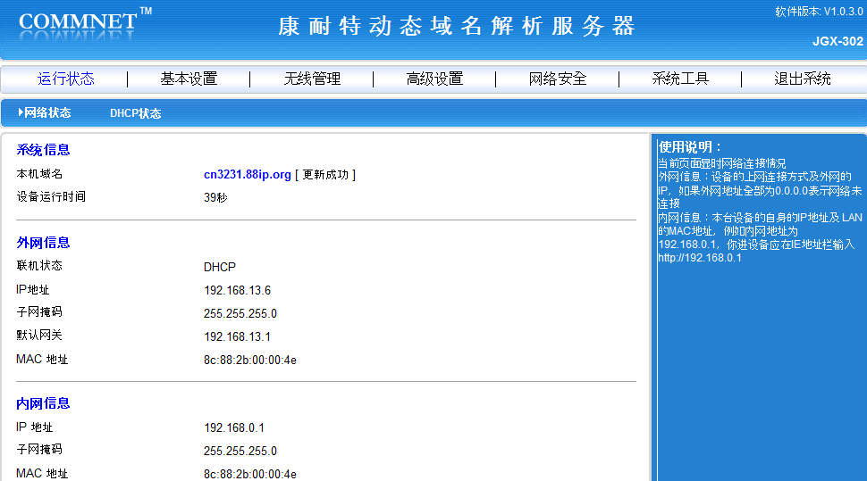 如圖:本設備的域名是cn3231.88ip.org, 只要聯(lián)上互聯(lián)網(wǎng)域名自運生效,不需要多余的設置,簡單易用