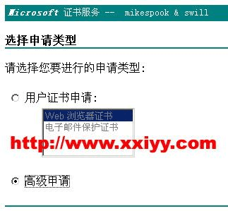 在“選擇申請類型”的時候應該選擇“高級申請”,以便導入在第二步時生成的IIS 證書(圖18)。