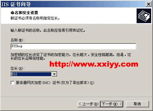 繼續(xù)“下一步”,會要求你輸入一個容易記憶的名稱來標識你的證書。同時會要求你選擇“位長”,實際上就是加密強度?!拔婚L”越大,越安全。當然這是以犧牲性能為代價的(圖10)。