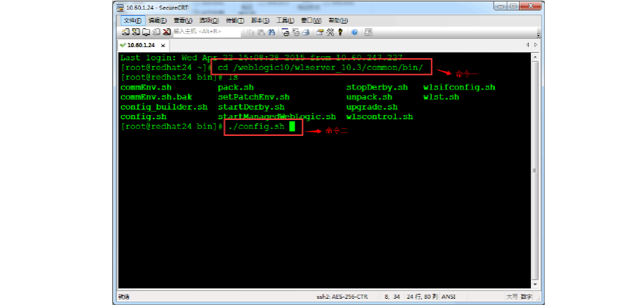 一、安裝發(fā)布Weblogi 域1、 使用遠(yuǎn)程工具登錄Linux 服務(wù)器,這里使用SecureCRT 軟件進(jìn)行截圖講解。2、 執(zhí)行如下圖命令一,進(jìn)入weblogic 發(fā)布服務(wù)所在目錄。執(zhí)行如下圖命令二,