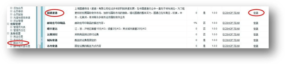 在左邊菜單欄里系統(tǒng)設(shè)置下選擇配送方式。然后在右邊列表中找到圓通速遞(也可以選擇其他的),點(diǎn)擊右邊安裝就完成了。頁(yè)面會(huì)自動(dòng)跳轉(zhuǎn)到新建配送區(qū)域,填寫完成后在所轄地區(qū)中選擇中國(guó)后點(diǎn)右邊的“ ”即可(省,市,縣不需填寫)。點(diǎn)擊確定。