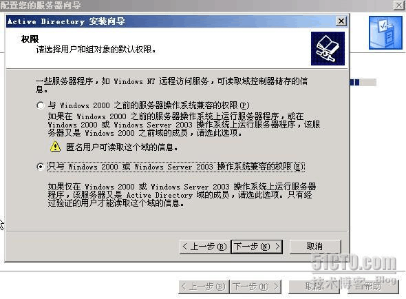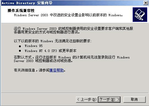這里是一個(gè)兼容性的要求,Windows 95及NT 4 SP3以前的版本無(wú)法登陸運(yùn)行到Wind ows Server 2003的域控制器,我建議大家盡量采用Windows 2000及以上的操作系統(tǒng)來(lái)做為客戶(hù)端。然后點(diǎn)擊“下一步”:
