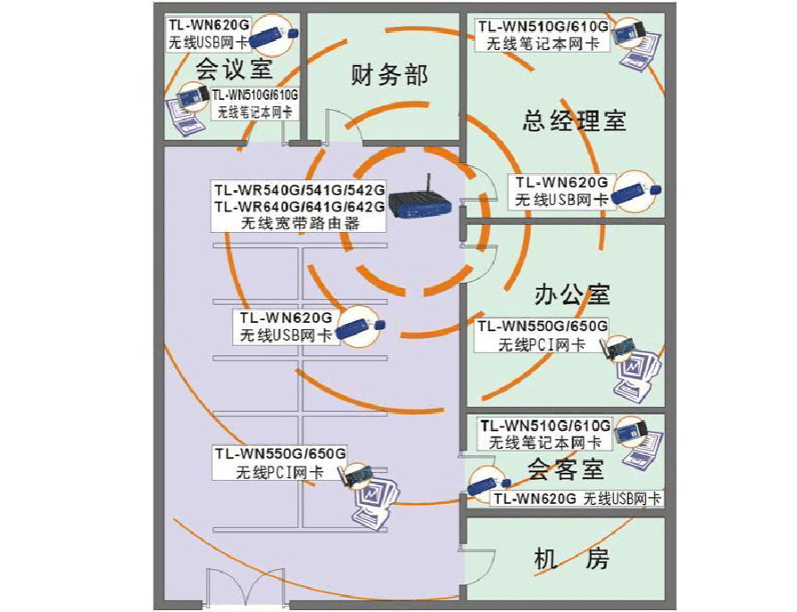 如圖所示,某企業(yè)辦公環(huán)境約1000平方米,采用無線網(wǎng)絡覆蓋,選擇TP-LINK 無線產(chǎn)品,將TP-LINK 域展?&速展? 無線寬帶路由器TL-WR640G/641G/642G放置在大廳(出于減少阻隔考慮)的任一位置(可掛壁安裝),即可以覆蓋整個辦公場所,所有地方均可通過TP-LINK 無線PCI 網(wǎng)卡TL-WN650G 、無線筆記本網(wǎng)卡TL-WN610G 或無線USB 網(wǎng)卡TL-WN620G 實現(xiàn)無線上網(wǎng)。