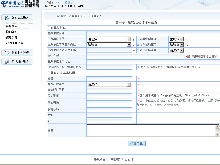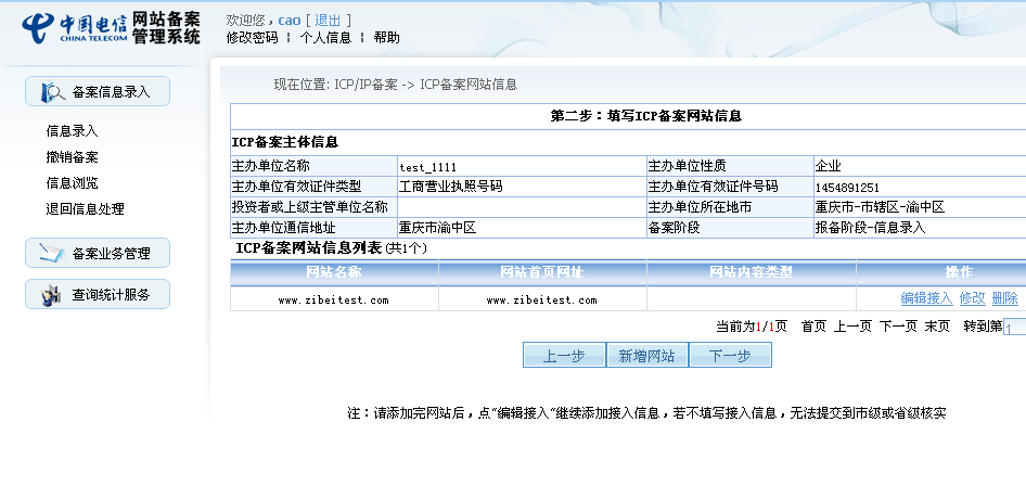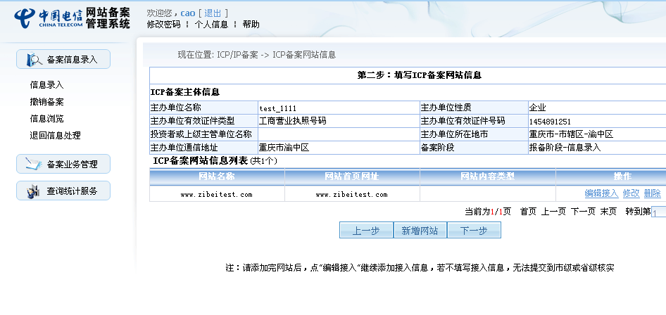 通過該頁(yè)面,用戶可以進(jìn)行信息錄入,撤銷備案,信息瀏覽,退回信息處理;注銷主體、注銷網(wǎng)站以及查詢備案進(jìn)度;