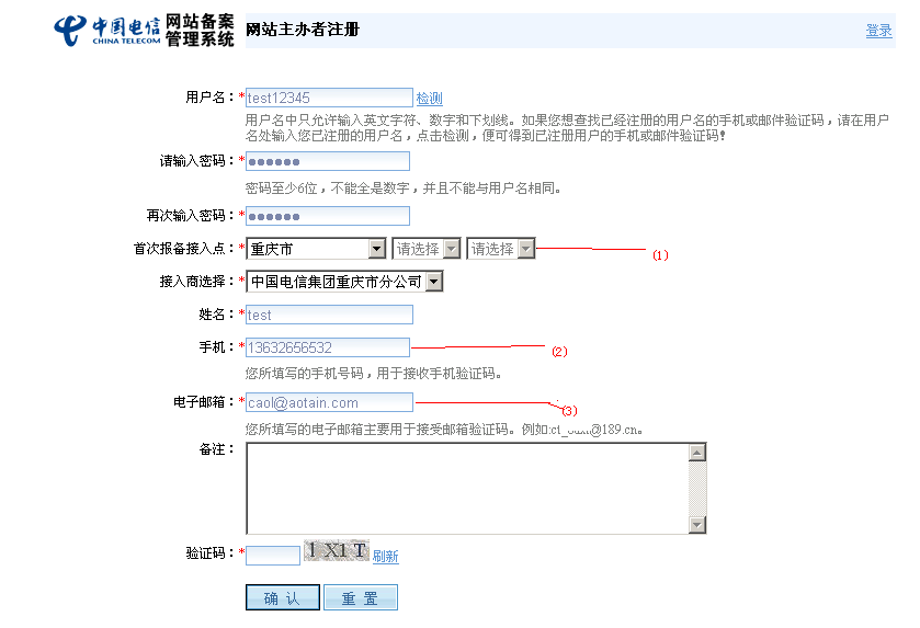 網(wǎng)站主辦者在這里填寫用戶名,密碼,首次報(bào)備接入點(diǎn),接入服務(wù)商(選擇省市后,在接入服務(wù)商的下拉框中會(huì)顯示該地市的接入服務(wù)商供選擇),以及注冊(cè)者姓名,手機(jī)、郵箱等聯(lián)系方式, 登陸時(shí)候的驗(yàn)證碼將會(huì)發(fā)到此郵箱,請(qǐng)務(wù)必填寫真實(shí)有效的郵箱。