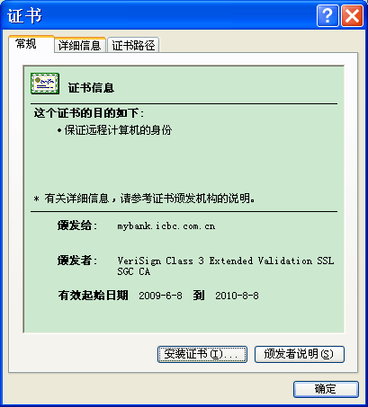 際權(quán)威機構(gòu)頒發(fā)的站點證書,通過該站點證書可有效識別站點身份。檢查方法是雙擊瀏覽器上的小鎖圖標后,就會顯示證書信息(提示:IE6的小鎖圖標在瀏覽器右下方的狀態(tài)欄上,IE7/8則在瀏覽器地址欄旁)。例如個人網(wǎng)銀站點證書信息應(yīng)如下顯示,請核對【頒發(fā)給】字段為中國工商銀行網(wǎng)站域名(見圖12)。