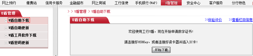 1. 正確登錄中國工商銀行網(wǎng)站→點擊“個人網(wǎng)上銀行登錄”→輸入賬號、登錄密碼、驗證碼,驗證通過后,請點擊“U 盾管理”→插入U 盾,點擊“開始下載”(見圖2)。