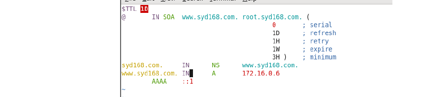 e) #cp named.localhost syd168.com.zone f) # vim syd168.com.zone