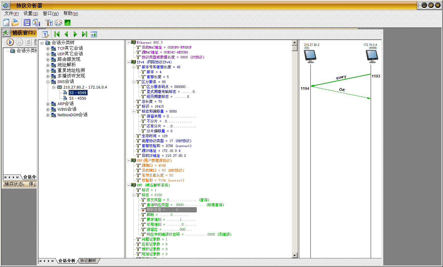 打開協(xié)議分析器,并開始捕獲數(shù)據(jù),定義主機(jī)的過濾器為DNS 協(xié)議