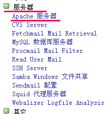 Linux 下的網(wǎng)站服務(wù)是由Apache 軟件來提供的,所以我們需要在webmin 中點(diǎn)擊" 服務(wù)器"-"Apache 服務(wù)器"(如下圖)