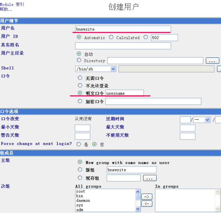 在" 創(chuàng)建新用戶" 表單中,輸入" 用戶名", 口令那兒選擇" 明文口令" 并輸入密碼即可,所有其它選項(xiàng)全部默認(rèn),并點(diǎn)新建即可.該用戶名與密碼即是FTP 上傳用戶名與密碼.(如下圖)