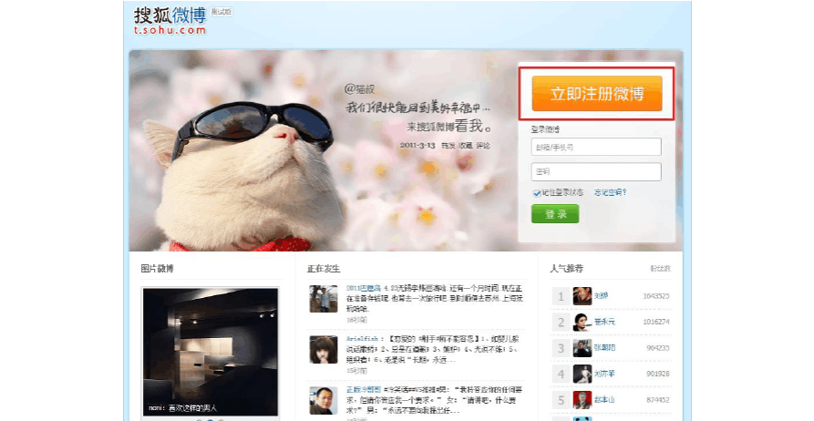 1. 進入t.sohu.com ,點擊“立即注冊微博”。
