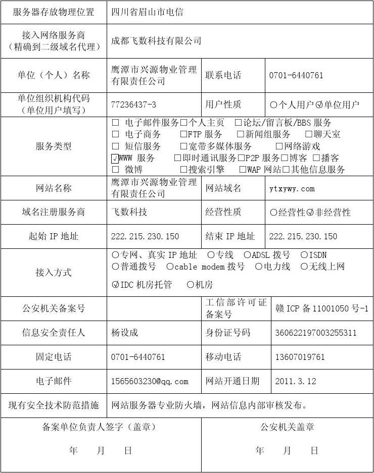 填表范圍:本表由國(guó)際互聯(lián)網(wǎng)網(wǎng)站開(kāi)辦單位(個(gè)人)用戶填寫(xiě)。一式兩份,一份留當(dāng)?shù)毓矙C(jī)關(guān)存檔備案,一份交互聯(lián)網(wǎng)單位收存。 單位備案編號(hào):由受理備案手續(xù)的公安機(jī)關(guān)統(tǒng)一編碼。編碼共14位,前6位是行政區(qū)劃代碼(參考國(guó)標(biāo)GBT2260-1999);中間兩位(即第7、8位)為網(wǎng)站單位性質(zhì)區(qū)別碼(統(tǒng)一規(guī)定為02);后6位是本行政區(qū)劃內(nèi)網(wǎng)站備案順序編號(hào)。