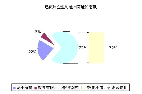 (3) 在對(duì)已使用通用網(wǎng)址的企業(yè)的調(diào)查結(jié)果中,有72的企業(yè)對(duì)通用網(wǎng)址的作用表示認(rèn)可,并表示會(huì)繼續(xù)使用通用網(wǎng)址;而在對(duì)還未曾使用通用網(wǎng)址的企業(yè)調(diào)查中,也有高達(dá)70的企業(yè)表示對(duì)通用網(wǎng)址很感興趣,準(zhǔn)備嘗試使用。這充分證明通用網(wǎng)址作為一種新興的網(wǎng)絡(luò)營銷工具,仍然具有廣闊的市場(chǎng)前景。