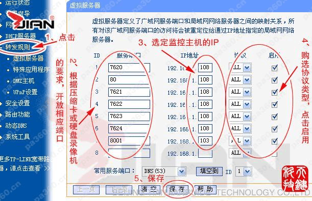 在IE 地址欄輸入:“192.168.1.1”,進(jìn)入路由器,點(diǎn)擊“轉(zhuǎn)發(fā)規(guī)則”,按照下圖依次填入以下內(nèi)容,并保存: