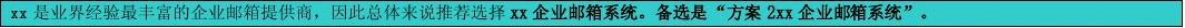 以上三家為國(guó)內(nèi)企業(yè)郵箱領(lǐng)域處于領(lǐng)先地位的郵箱提供商,無論是硬件、軟件、后續(xù)服務(wù)及未來發(fā)展等各方面條件都是最優(yōu)越的。建議選擇“方案3:xx 企業(yè)郵箱系統(tǒng)”,購(gòu)買xx 。