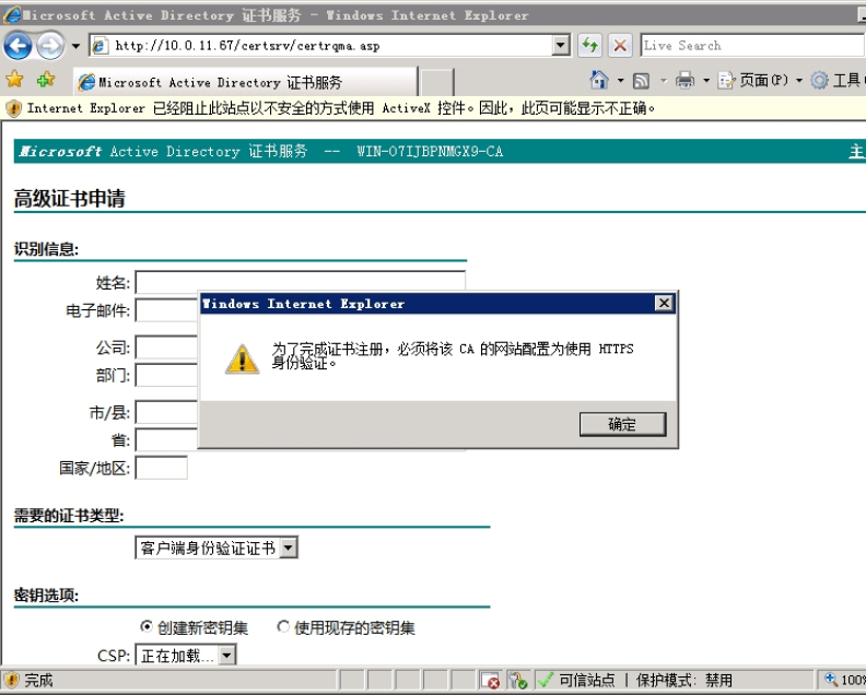 此時會出現(xiàn)證書服務(wù)頁面;此網(wǎng)站如果點擊【申請證書】,進入下一界面點擊【高級證書申請】,進入下一界面點擊【創(chuàng)建并向此CA 提交一個申請】,進入下一界面,此時會彈出一個提示窗口:“為了完成證書注冊,必須將該CA 的網(wǎng)站配置為使用HTTPS 身份驗證”;也就是必須將HTTP 網(wǎng)站配置為HTTPS 的網(wǎng)站,才能正常訪問當前網(wǎng)頁及功能;